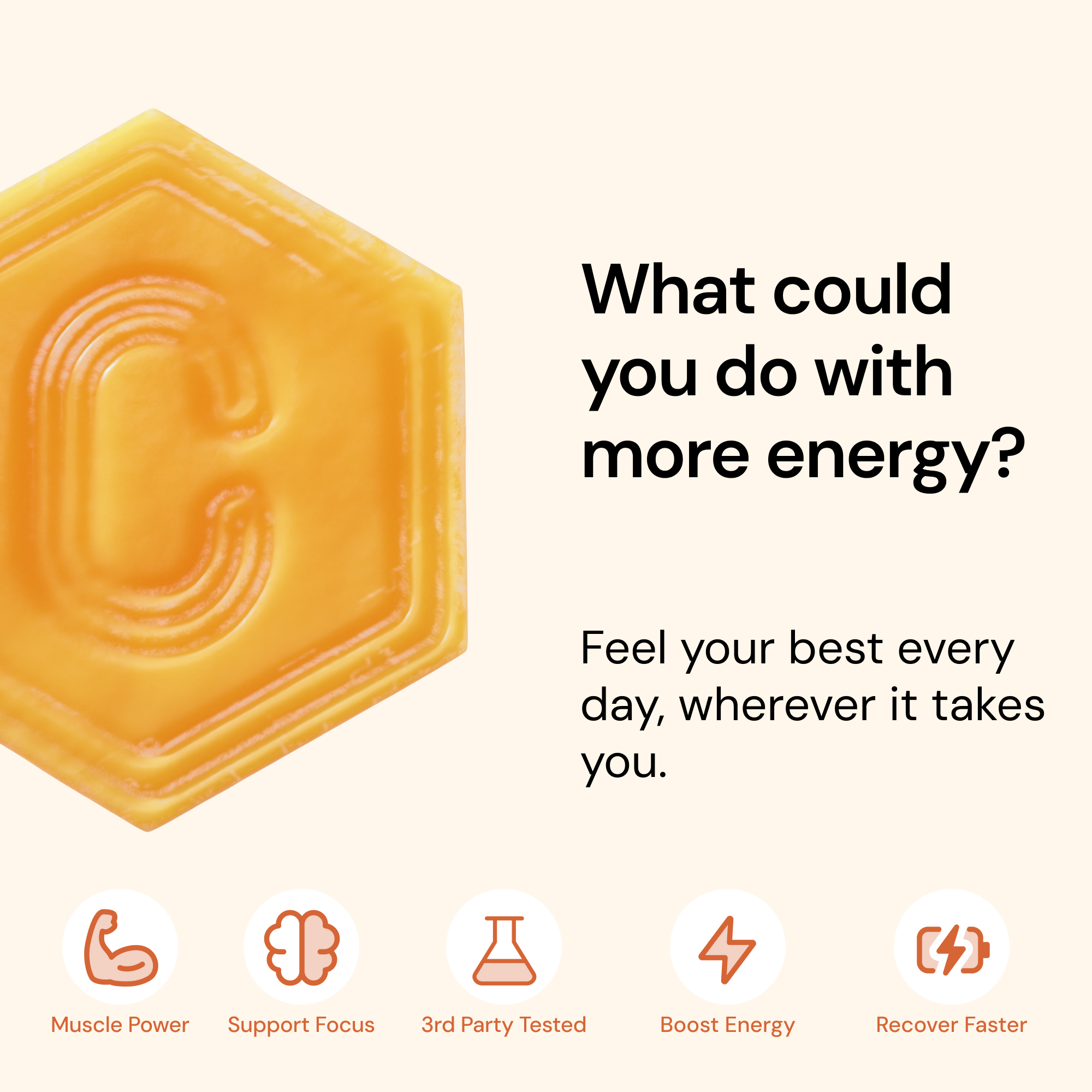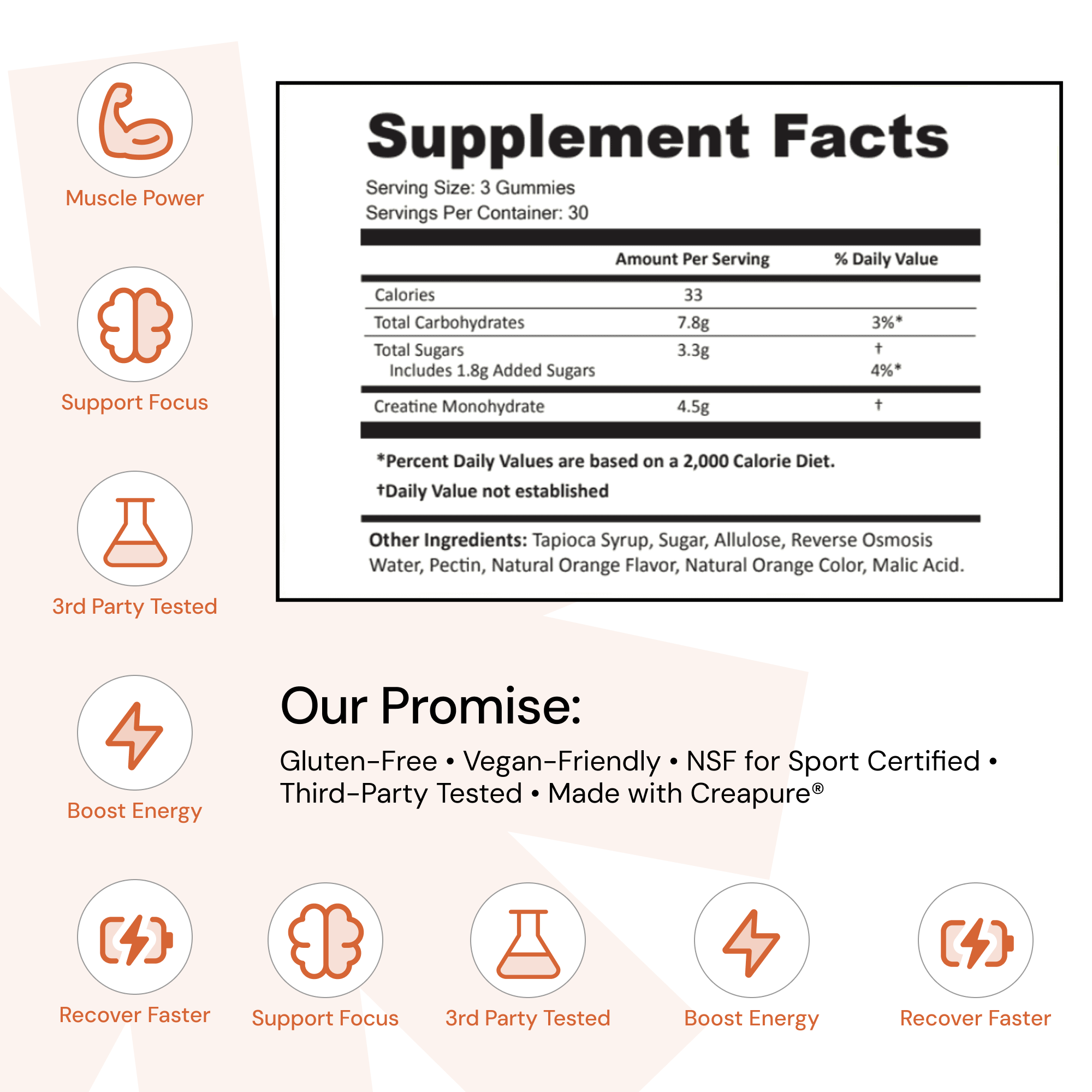 Core Gummies - Orange: Creatine Monohydrate, Tapioca Syrup, Sugar, Allulose, Reverse Osmosis Water, Pectin, Natural Orange Flavor, Natural Orange Color, Malic Acid