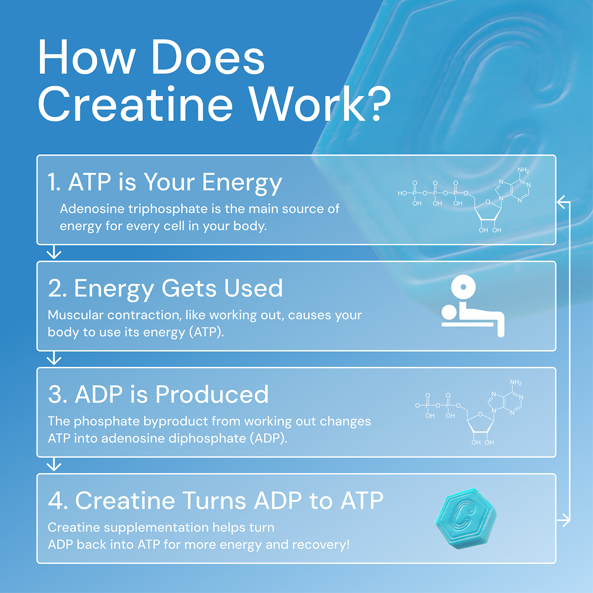The main benefits of creatine are increasing strength, building muscle, muscle recovery, and improved mental acuity.