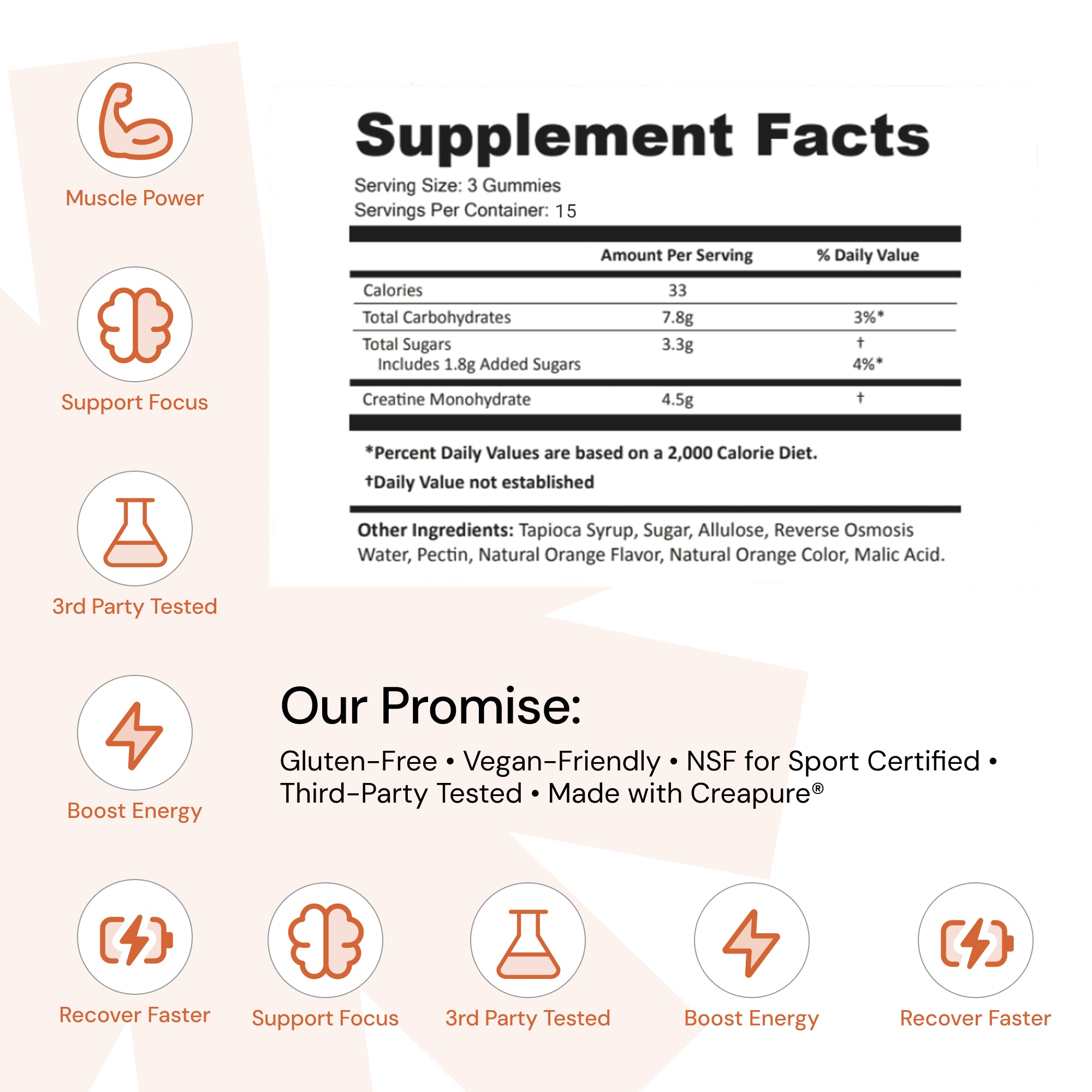 Our creatine monohydrate gummies are designed for purity, taste and convenience. We make creatine supplementation easy, enjoyable and effective. Each gummy now contains 1.5 grams of creatine monohydrate.