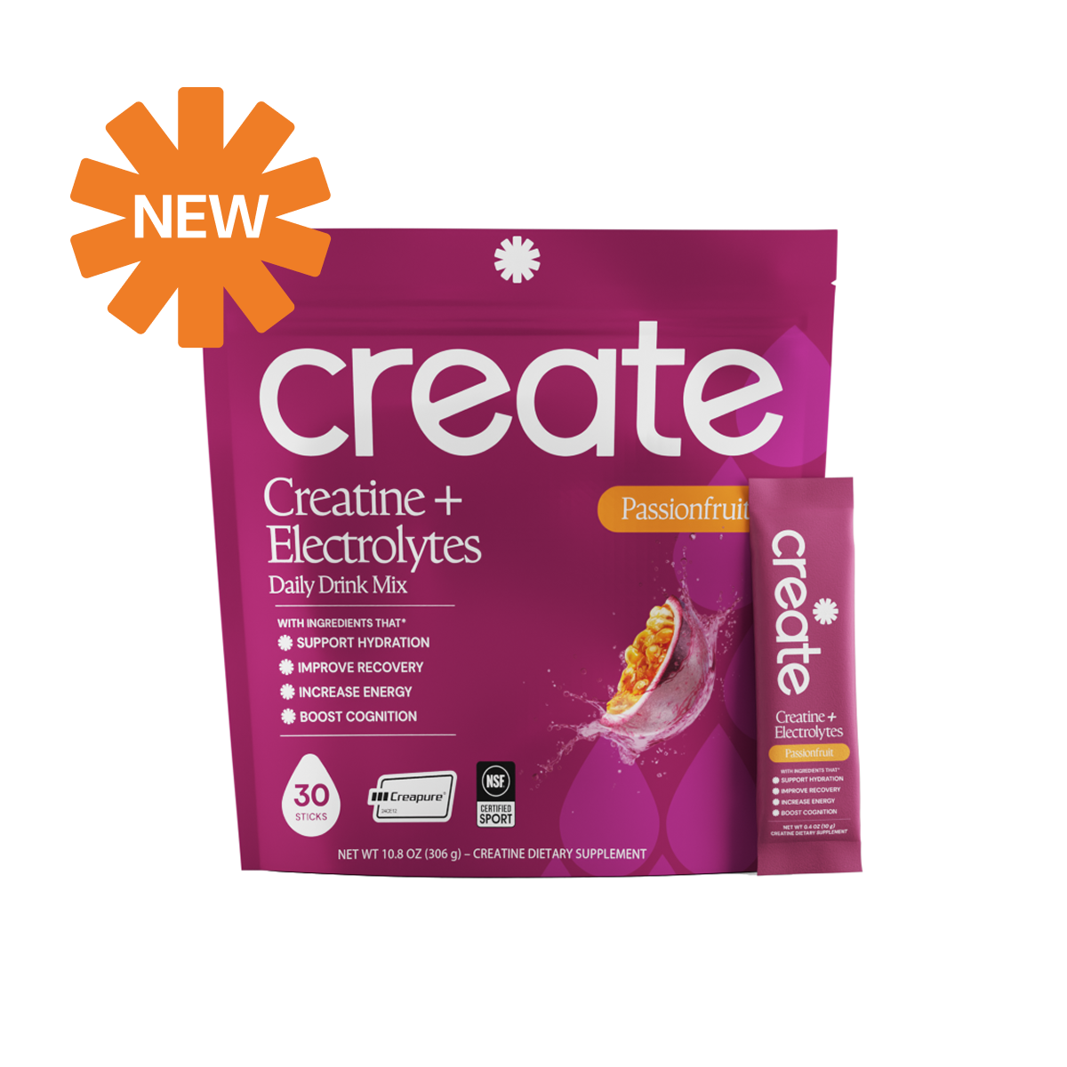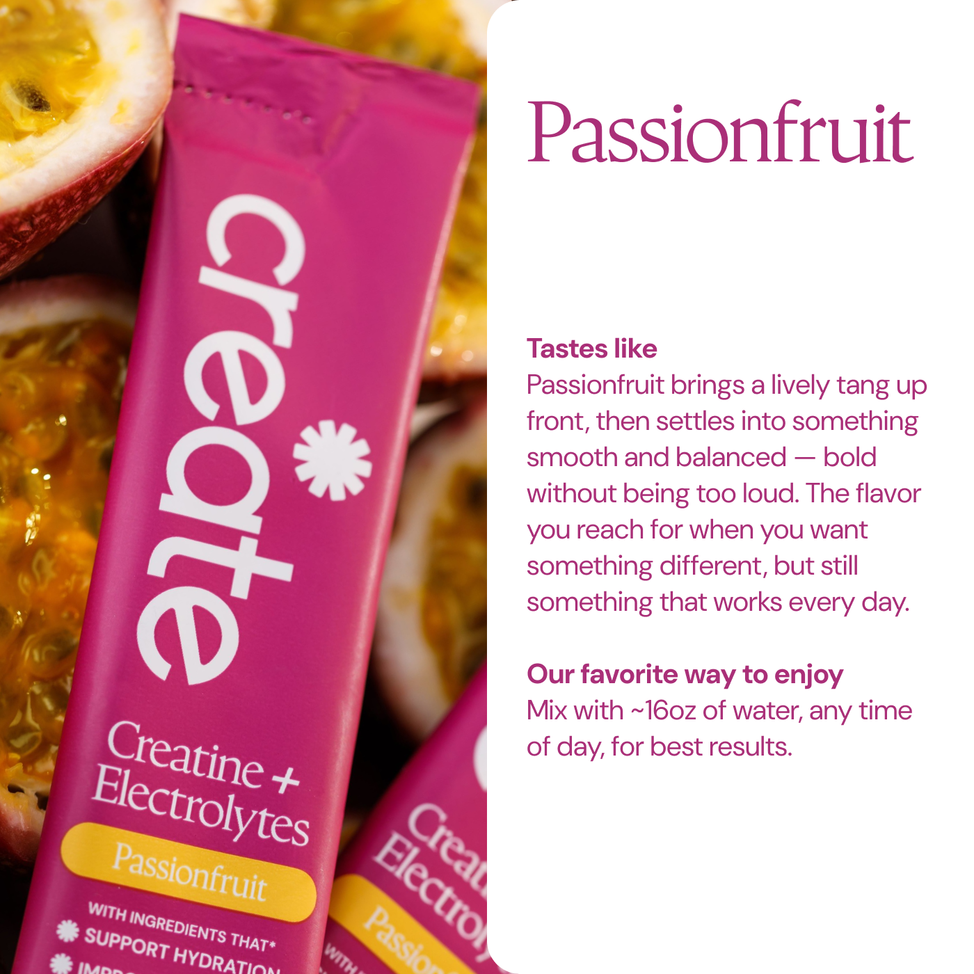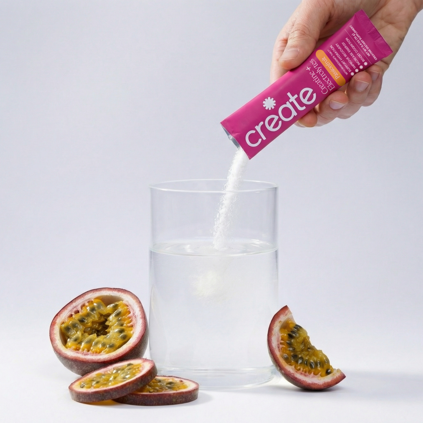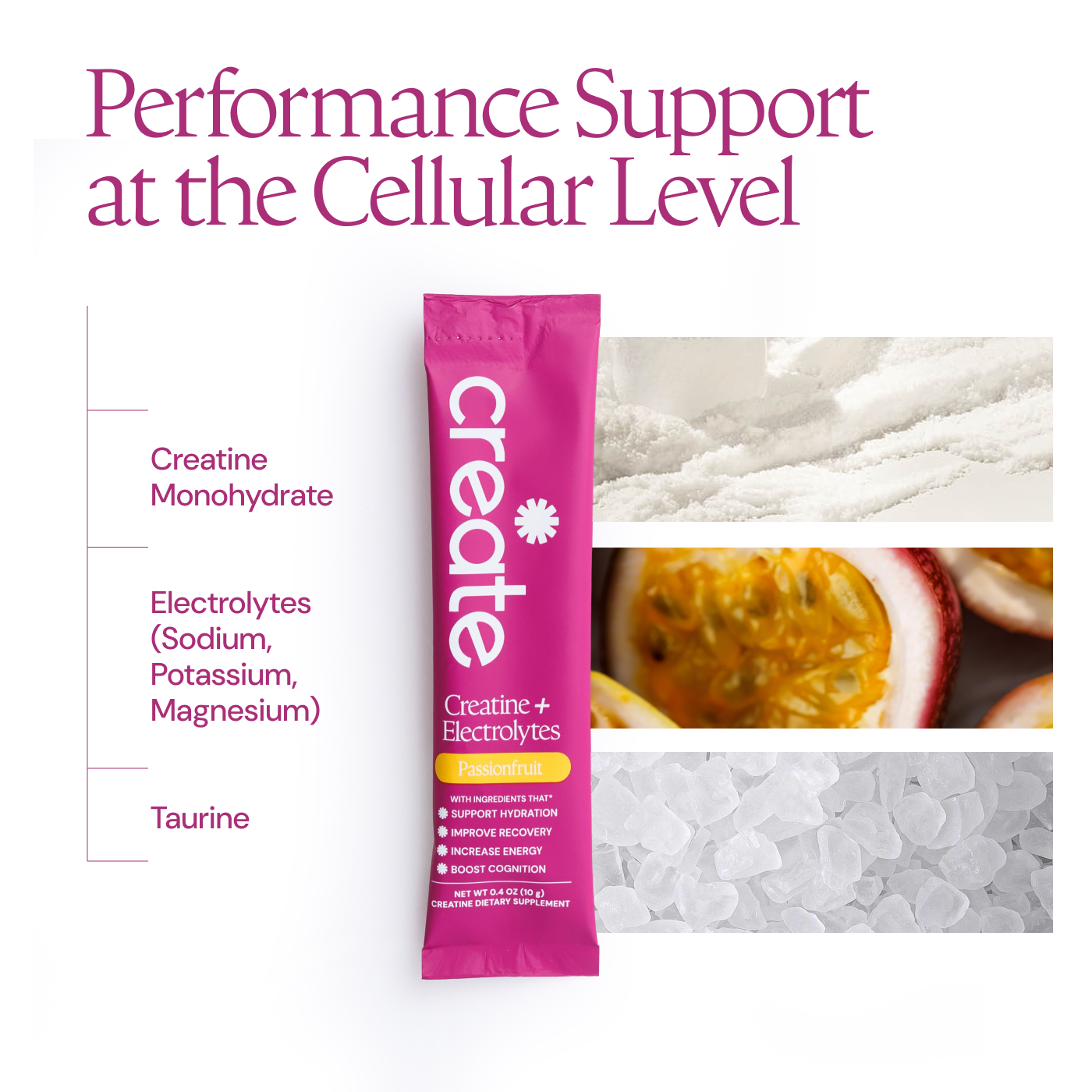 Passion Fruit: Creatine Monohydrate, Sodium, Potassium, Magnesium, Taurine, Other Ingredients: Sea salt, citric acid, tartaric acid, natural flavoring, malic acid, OnoSweet (Reb-M 95%)