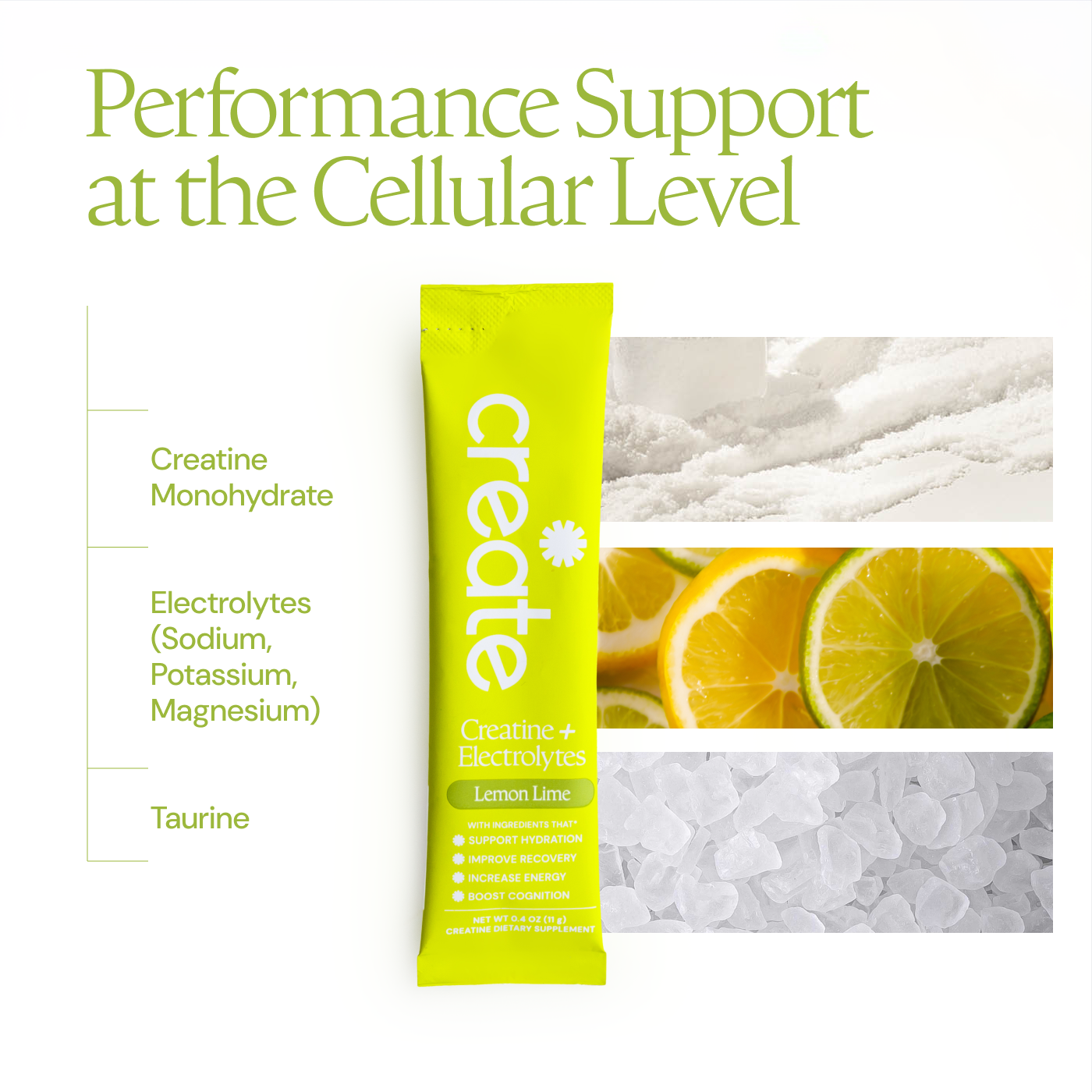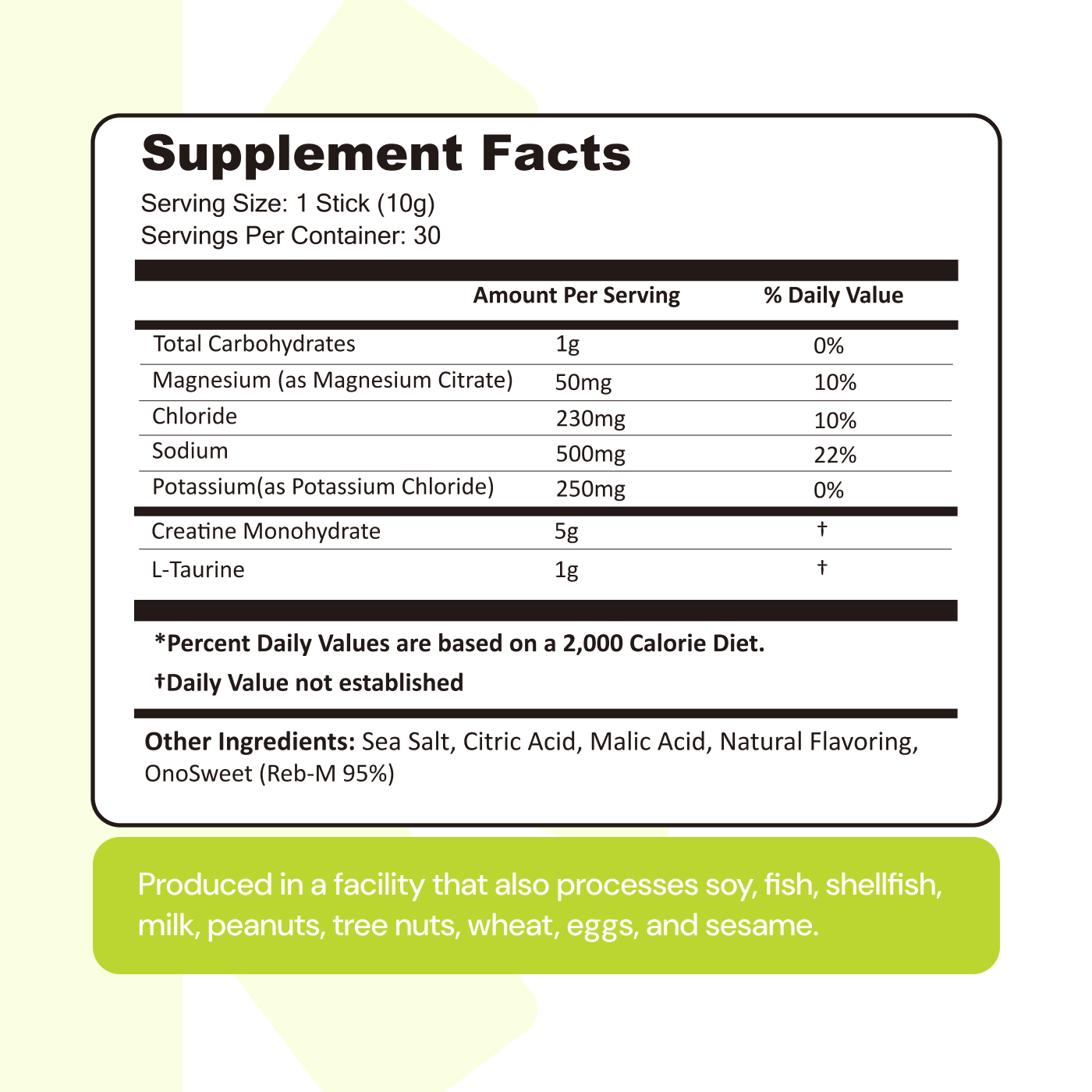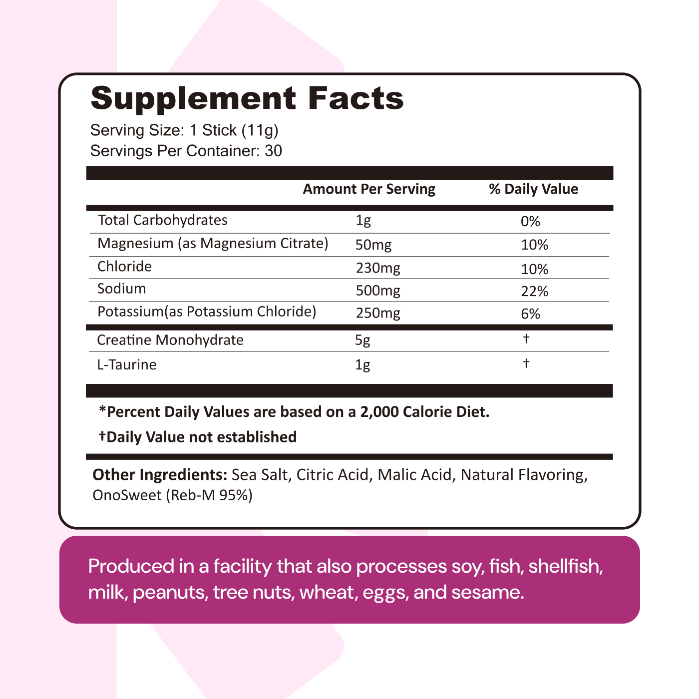 Lemon Lime: Creatine Monohydrate, Sodium, Potassium, Magnesium, Taurine, Other Ingredients: Sea salt, citric acid, malic acid, natural flavoring, OnoSweet (Reb-M 95%)